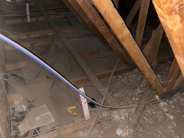 We began by air-sealing visible leakage points using closed-cell foam. This is done to help prevent air from flowing between the attic and living spaces of the home. We then blew in 14 inches of premium, fiberglass insulation, bringing the attic up to the Energy Star-recommended R38 level.